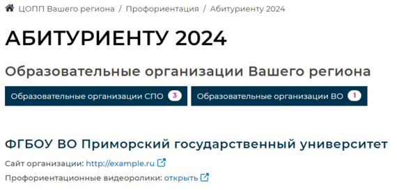 На странице Абитуриенту размещаются все образовательные организации региона среднего профессионального и высшего образования со ссылками на официальный сайт организации и профориентационный видеоролик. Пользователь может отфильтровать организации и выбрать только организации СПО, либо организации ВО.