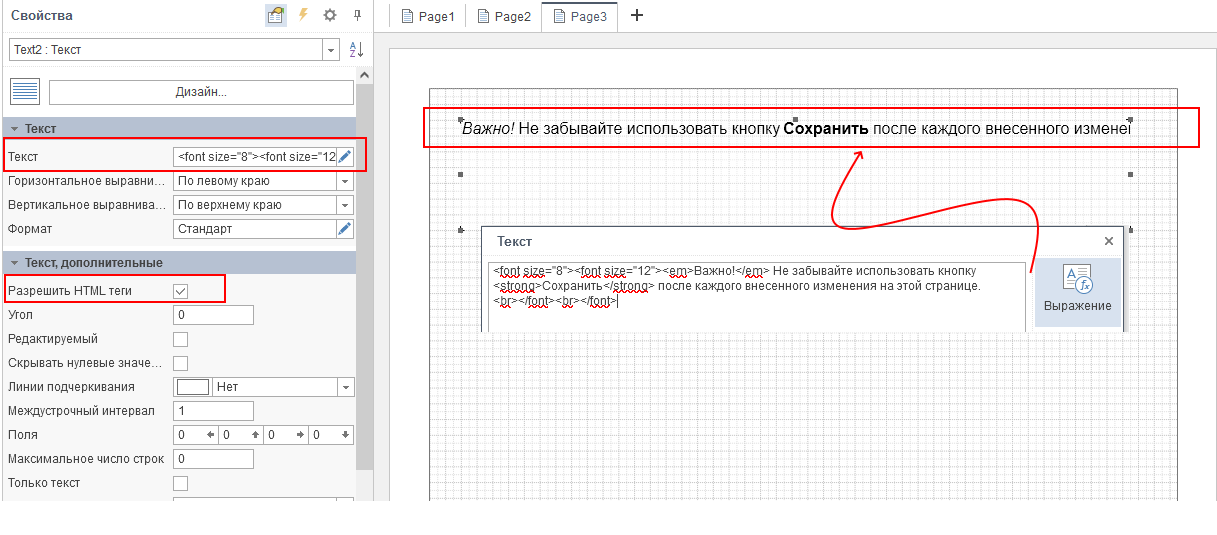 Стоит учитывать, что по умолчанию HTML теги игнорируются. Чтобы разрешить использование HTML тегов в текстовом выражении нужно использовать свойство Разрешить Html теги.