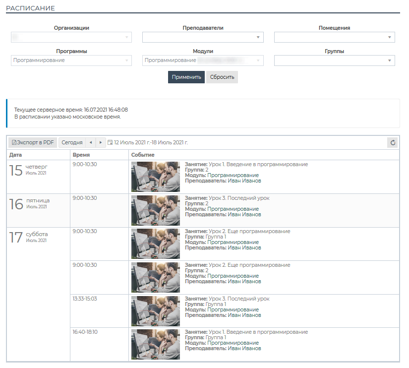 . Откроется карточка модуля, раздел «Расписание».