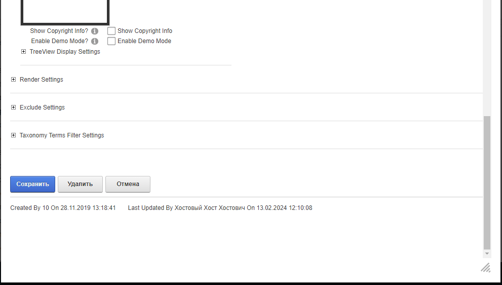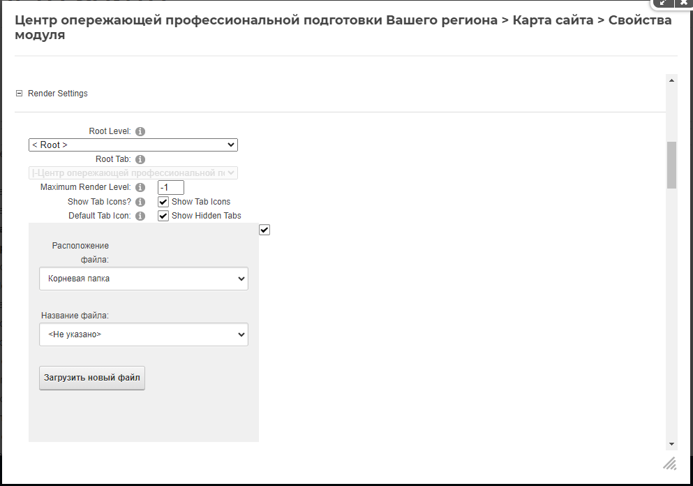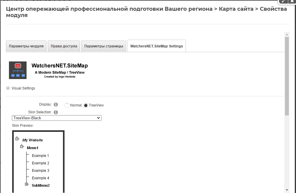 Работа с модулями и их настройками (вкладки: Параметры модуля, Права доступа, Параметры страницы) рассмотрена в пункте Работа с модулем «HTML». Для настройки самой «Карты сайта» необходимо перейти на вкладку Настройки WatchersNET.SiteMap.