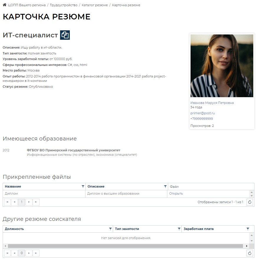Карточка резюме содержит всю информацию о конкретном резюме пользователя, внесённую при создании соискателем: