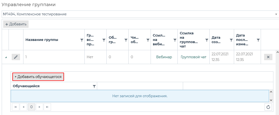 Во всплывающем окне со списком записавшихся на обучение нажать напротив имени студента кнопку [Добавить], либо [Добавить во все смежные группы], если студент записался на все модули процесса.