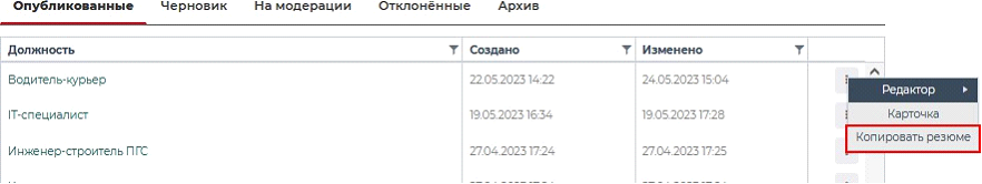 Новое резюме, созданное на основе скопированного появится в списке на странице «Мои резюме» в разделе «Черновик».