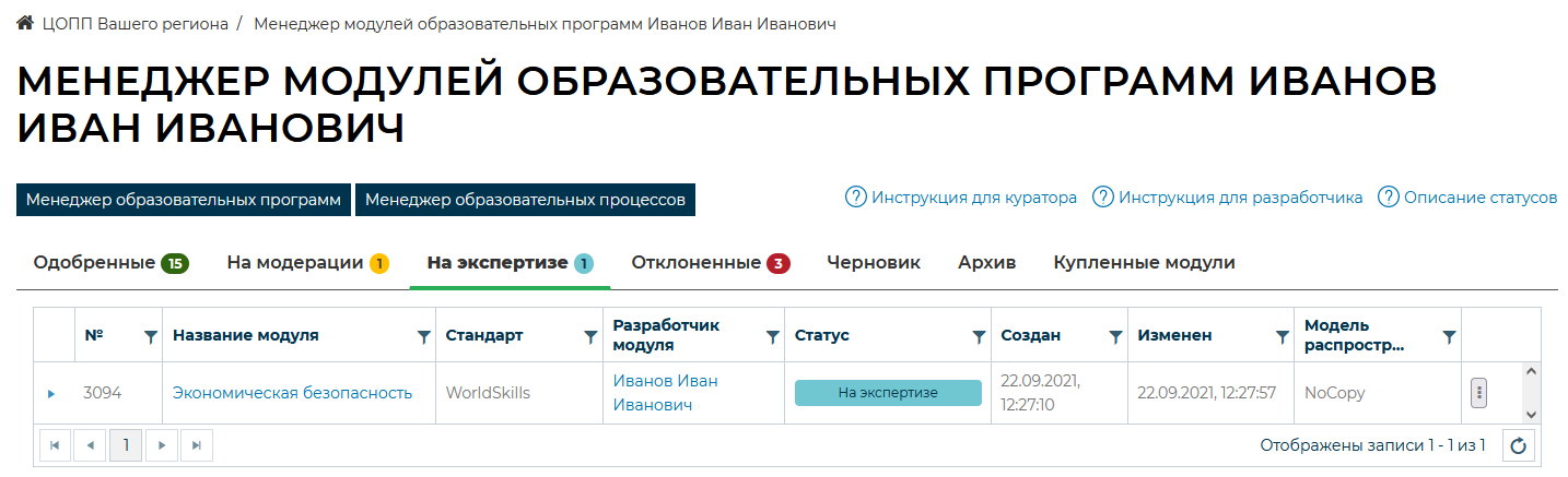 Менеджер модулей образовательных программ. Вкладка «На экспертизе»