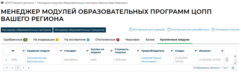 Менеджер модулей образовательных программ. Вкладка «Купленные модули»
