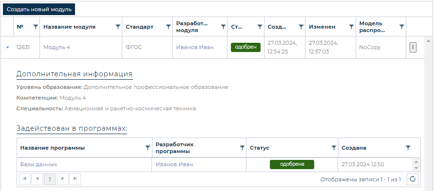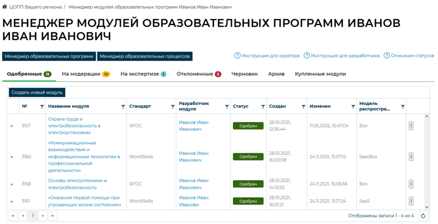 Менеджер модулей образовательных программ. Вкладка «Одобренные»