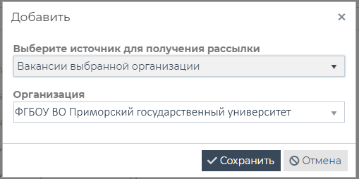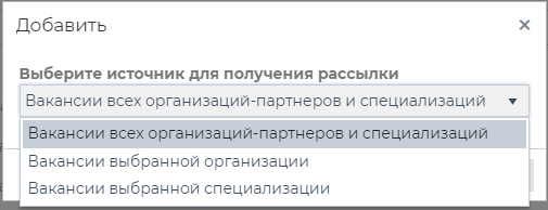 После выбора источника для получения рассылки. необходимо также выбрать организацию, либо специализацию.