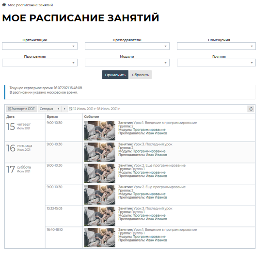 раздел Мое обучение и перейти на Мое расписание обучающегося. Загрузится страница, на которой представлены Дата проведения, Время и События (Занятия) обучающегося по курсу.