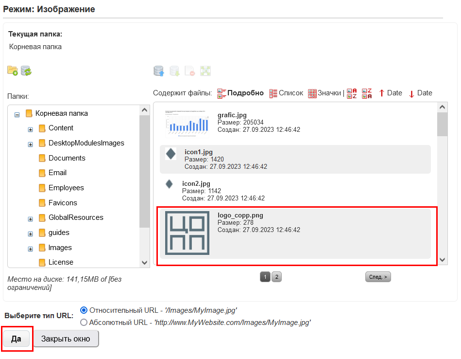 В загрузившемся всплывающем окне выбрать заранее загруженное на сервер изображение.