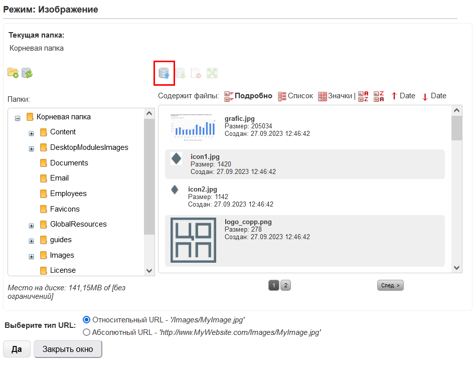 Если изображение ранее не было загружено, то его можно загрузиться самостоятельно во вкладке Ссылка. Для этого нажать кнопку Выбор на сервере, и загрузить необходимое изображение, нажав на символ загрузки
