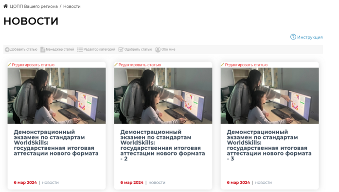 Новостной модуль EasyDNNNews для просмотра и редактирования доступен из глобального меню пункт Новости, для редактирования и добавления контента – Модератору, для настроек - Администратору ЦОПП.