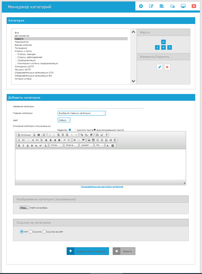 Для создания новой категории новостей, изменения и удаления имеющейся нужно зайти в Панель управления и выбрать пункт Управление категориями или из любого раздела редактора (Настройки, Управление статьями и прочее) → иконка сверху