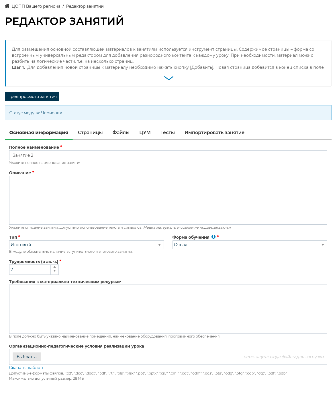 в конструкторе модуля на новой вкладке загружается страница «Редактор занятий» с открытой вкладкой «Основная информация».