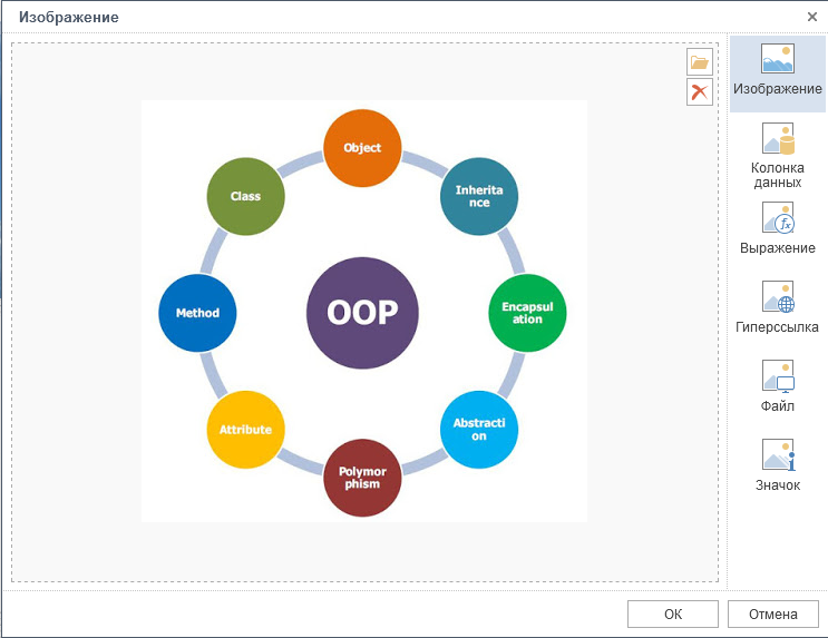Кроме прямой загрузки картинки, оно может быть извлечено из файла, который будет загружен из локального источника. Например, следует указать путь к файлу d:\image.png. В этом случае, в момент построения отчета, из файла image.png будет извлечено изображение и вставлено в компонент Картинка.