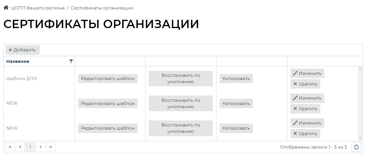 На странице расположен список шаблонов сертификатов, которые выдаются обучающимся по окончании образовательного процесса. Для каждого процесса можно выбрать свой сертификат.