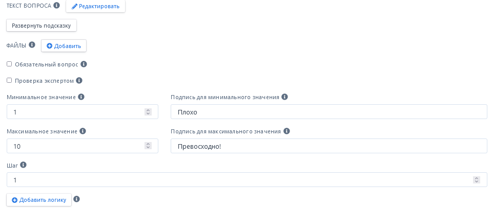 К этому типу вопроса можно прикрепить файл и выбрать пункт – обязательный вопрос (во время прохождения анкеты его нельзя пропустить), а также добавить подписи к минимальному и максимальному значению.