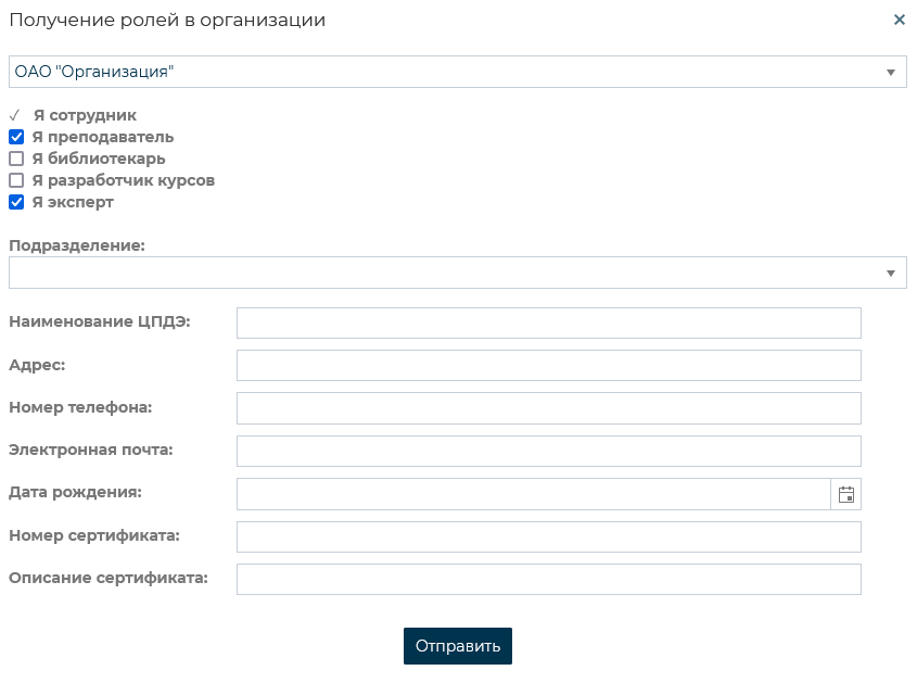 В появившейся форме необходимо выбрать организацию, а также отметить роли, которые пользователь планирует получить и нажать кнопку