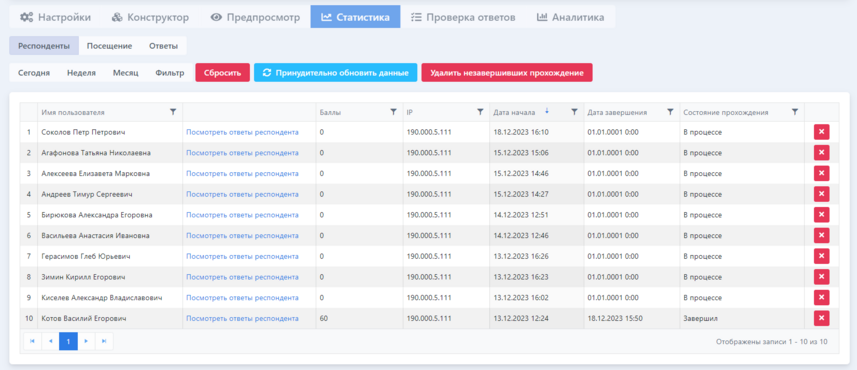 Отображение вкладки Статистика. Список респондентов, прошедших анкету