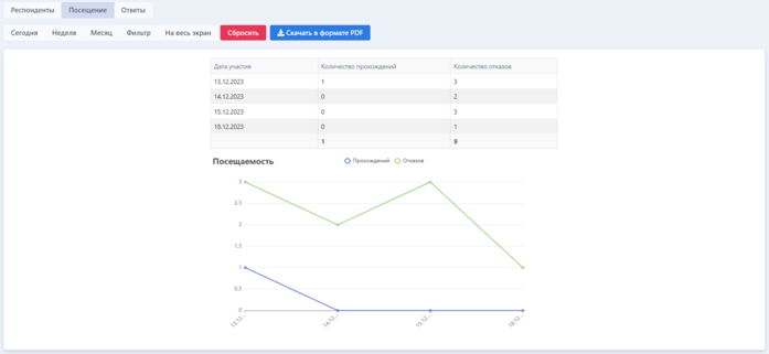 Статистика – простые аналитические отчёты (ответы на вопросы, аналитика посещения, базовая информация о респондентах). Есть возможность просматривать списки респондентов с возможностью применения сортировки и фильтров по некоторым параметрам. Можно просмотреть каждую анкету респондента отдельно. Также предусмотрена выгрузка анкет и ответов респондентов в файл в формате PDF.