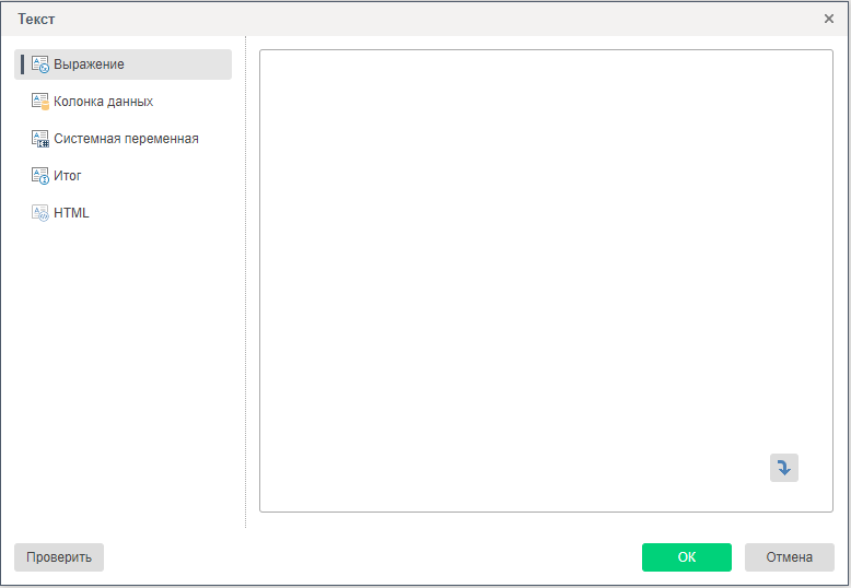 Редактор содержит несколько вкладок, в которых можно изменить выражение текстового компонента, выбрать колонку данных, системную переменную, указать расчет итогов, вставить html.