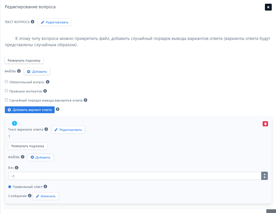 К этому типу вопроса можно прикрепить файл, добавить случайный порядок вывода вариантов ответа (варианты ответа будут представлены случайным образом).