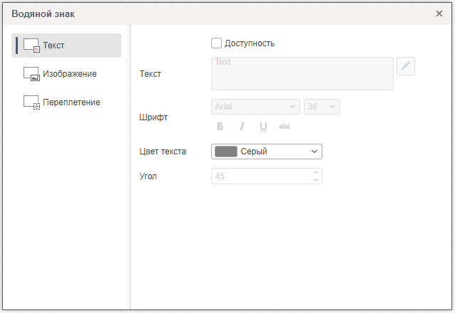 При создании водяного знака для панели индикаторов, можно использовать различные комбинации режимов водяного знака. Например, изображение и текст, или текст и переплетения, или всё вместе.