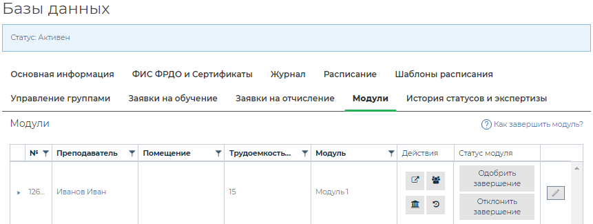 Если есть модули, на которых нет никаких заявок или нет ни одной необработанной заявки и нет активных студентов в группе, то ответственный может завершить процесс без подачи преподавателем заявки на завершение модуля. У преподавателя также имеется возможность завершить свой модуль, который удовлетворяет перечисленным выше условиям.